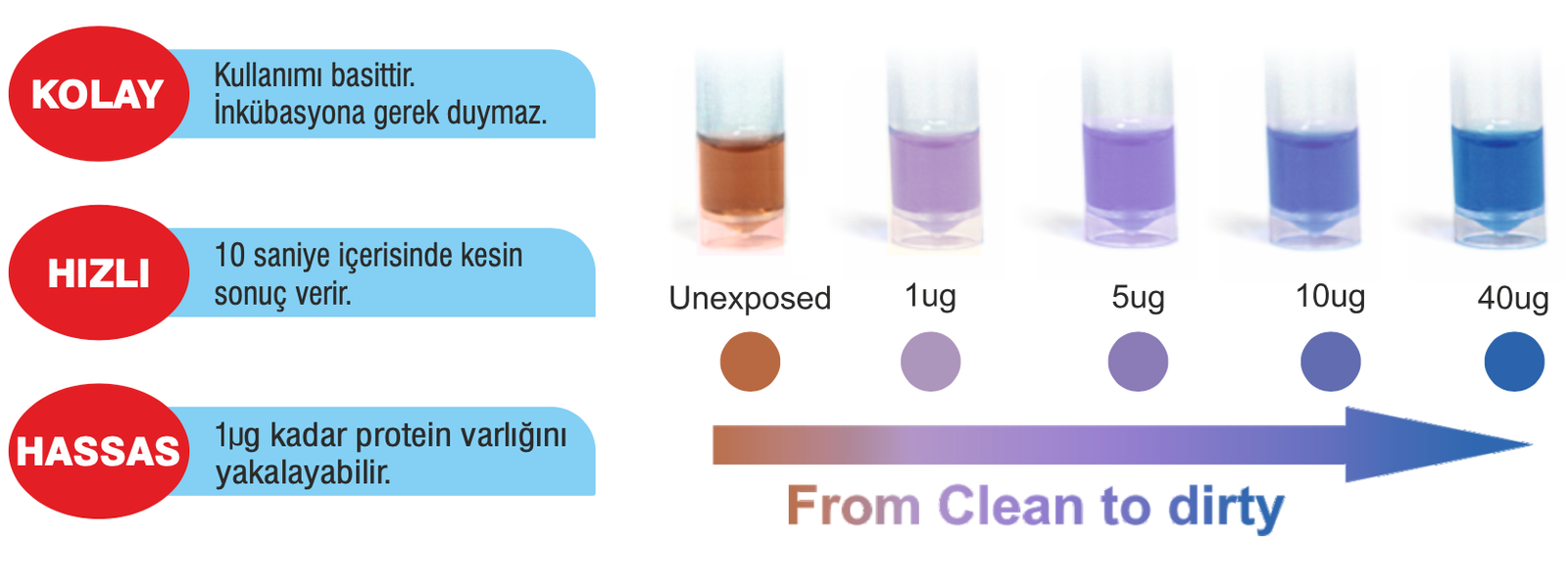 WİSAS Protein Kalıntı Testi, cerrahi aletler üzerinde kalabilecek protein kalıntılarının testini yapabilmek amacıyla kullanılan üründür. Harici bir cihaz ihtiyacı olmadan renk değişimi 10 saniyede kolayca ve hızlı bir şekilde sonuca ulaşır. Protein kalıntı seviyesi ne kadar yüksek olursa sonuç daha hızlı ve kademeli şekilde mor daha sonra mavi renge döner